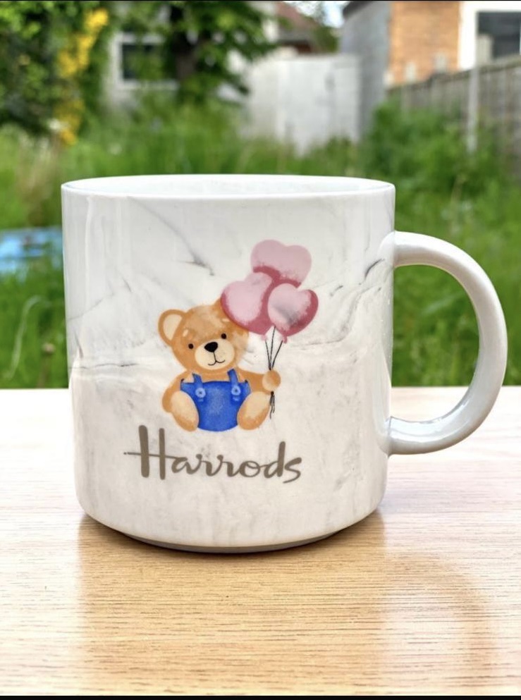 grey marble effect cups with Harrods on