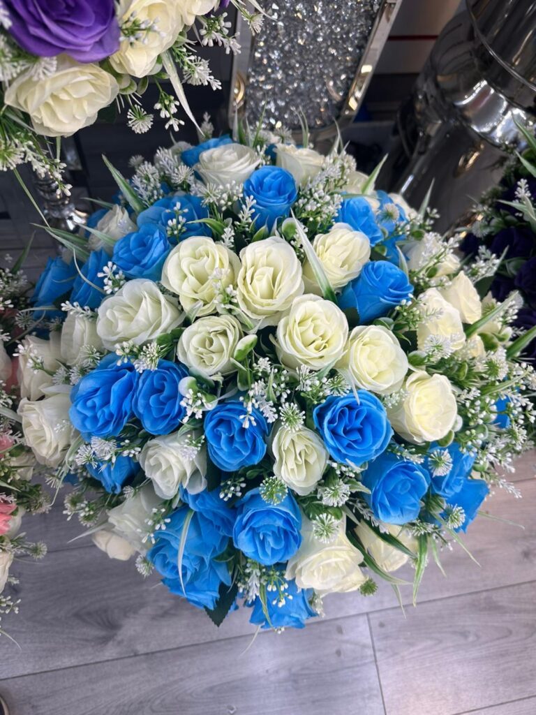 light blue 24 head bouquet with foliage